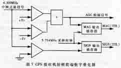 为配合通道单元和解算单元完成导航信号的数据提取及信号处理,在5.714MHz采样时钟控制下,GP2010的片内集成数字量化器可实现对4.309MHz的中频卫星信号进行数字量化,从而为通道单元相关器提供TTL电平的2位量化输出,即1.405MHz的二进制符号及量值数字信息,如图7所示。为了得到平稳的中频卫星信号及采样数字输出,该模块同时产生AGC控制信号用于稳定第三级变频(如图5(b)所示)时所产生的中频信号幅度。